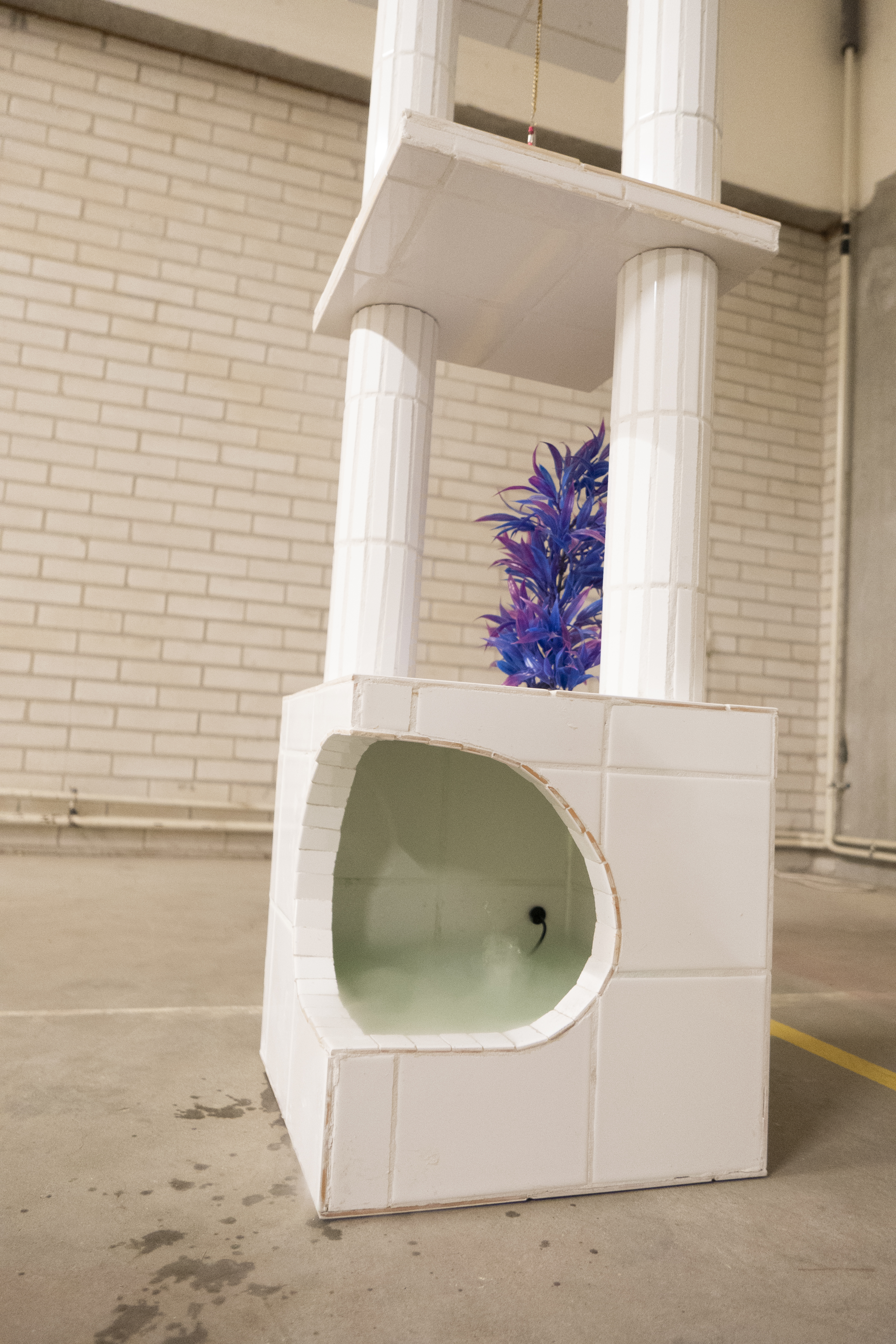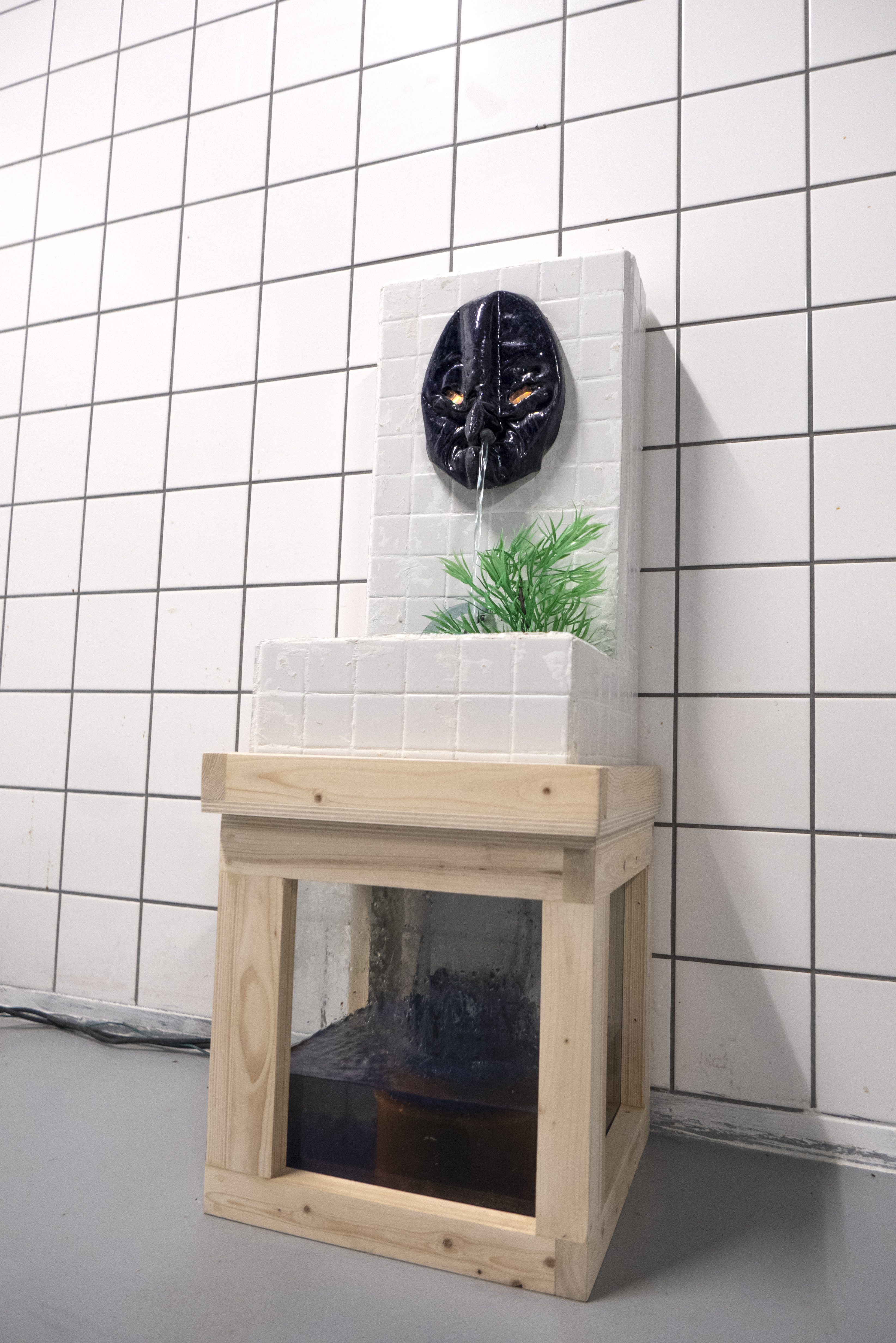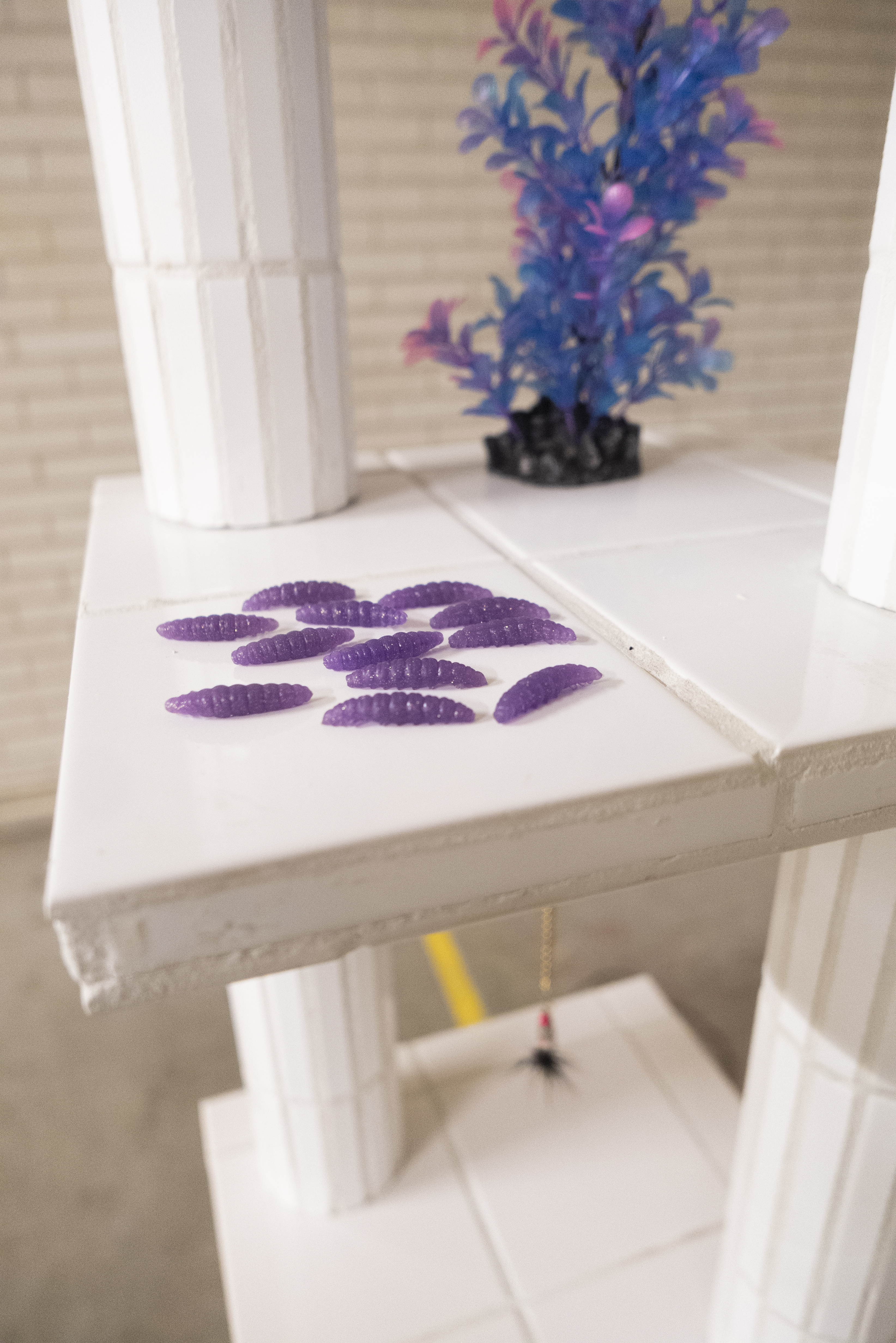 Tiles, epoxy, aquarium plants, artificial maggots, fake gold chains, steam device